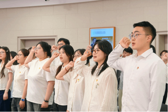 在重温入党誓词环节,全体毕业生党员在颜晔老师的领誓下,庄严宣誓,再次铭记党员的初心与使命。