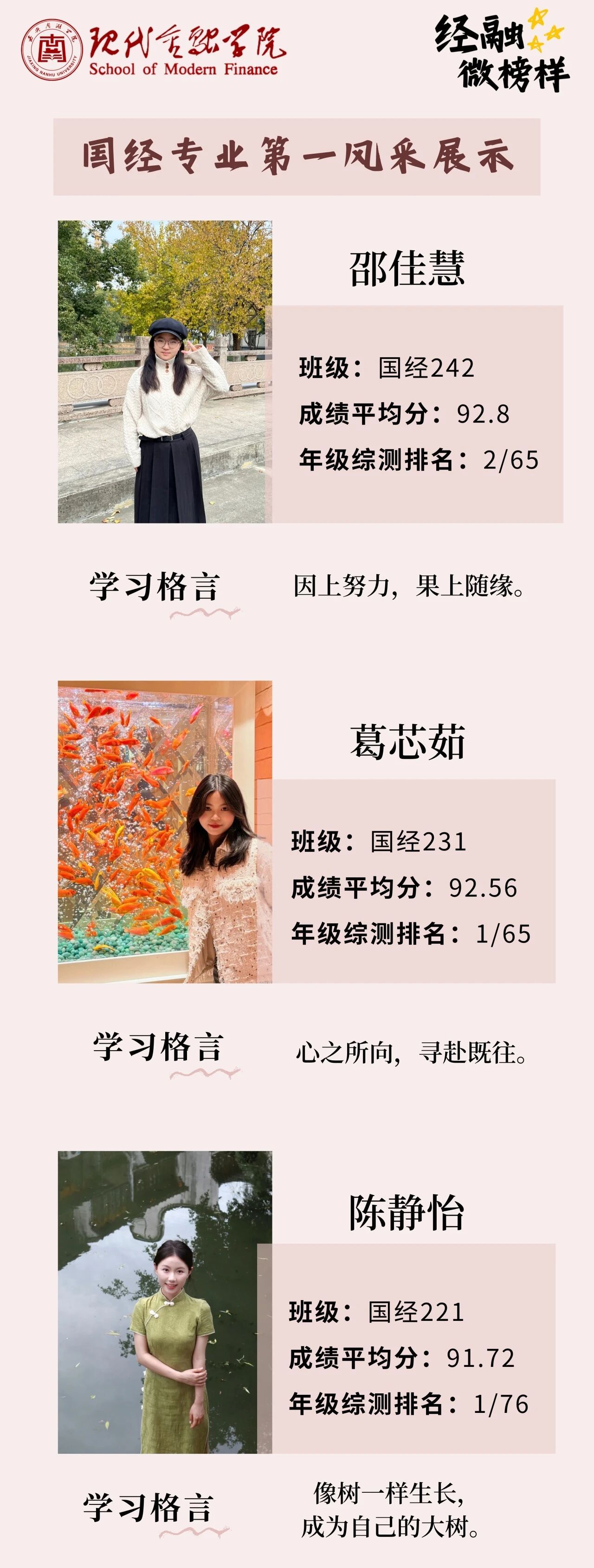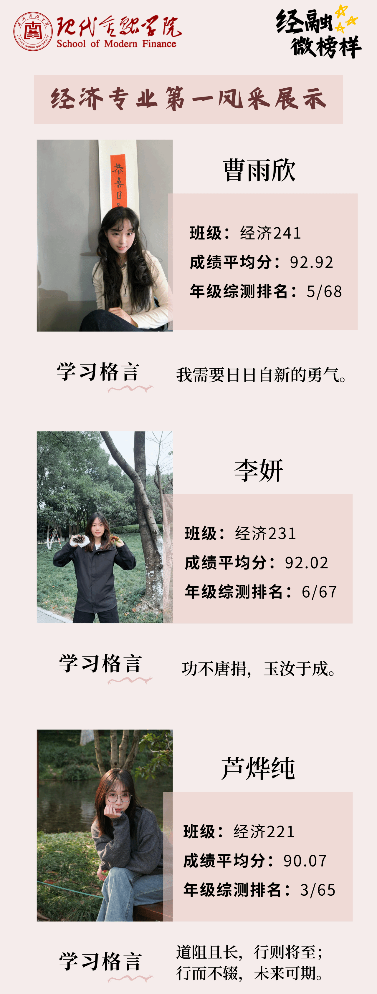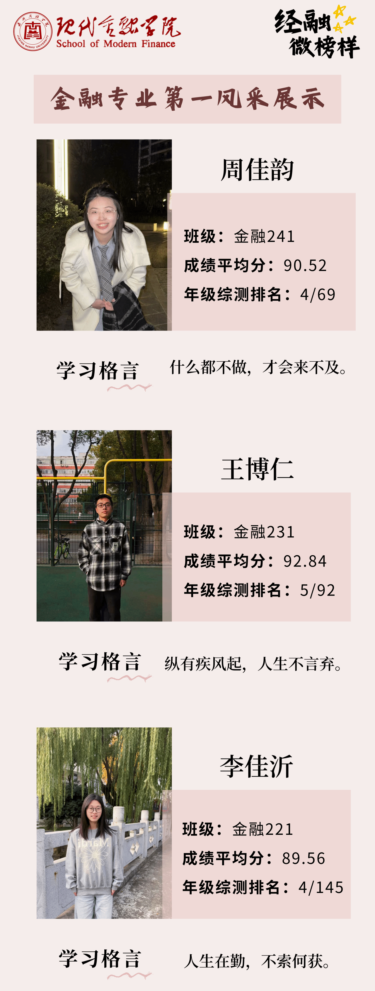 在2024-2025学年,一批优秀学子在“经道立信,融智创新”的院训指引下,成绩名列前茅。本期“逐梦经融·经融微榜样”集中展示了他们的风采。以下九名同学是经融学子的优秀代表,他们用汗水和努力实现了自己的学习目标,作为榜样引领更多同学能加入到争先创优的队伍中来,共同创建学风优良型、比学赶帮型的现代金融学院。