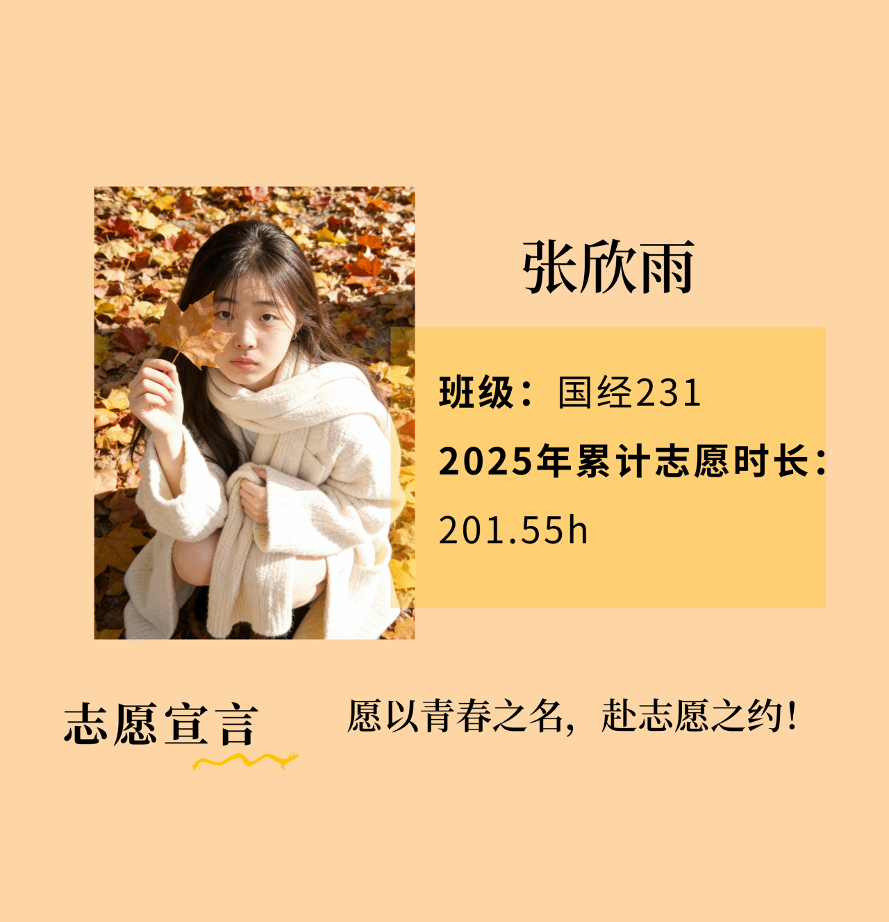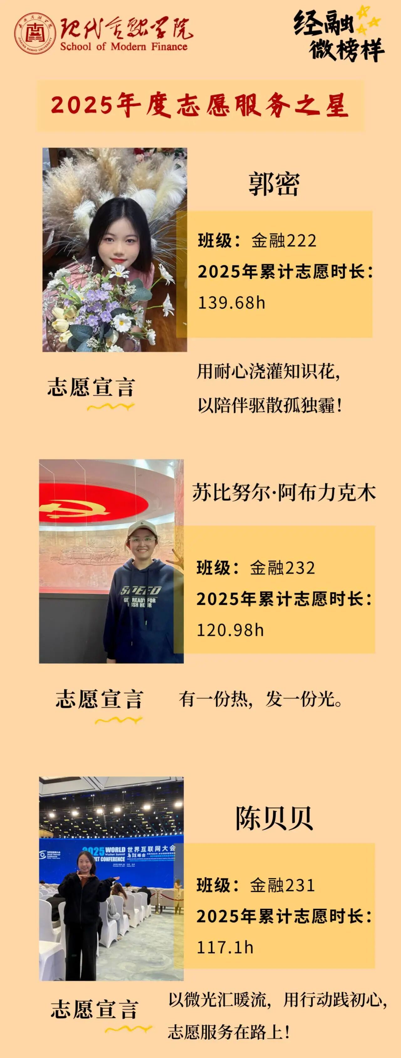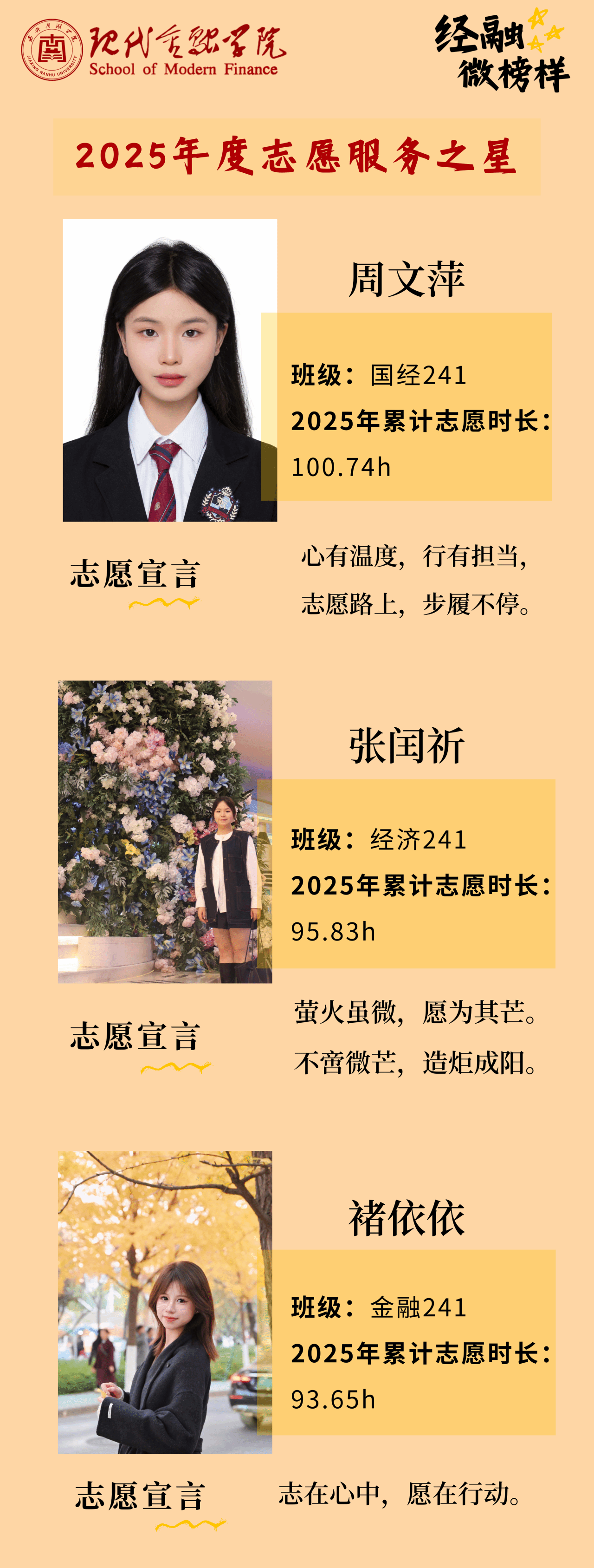 在2025年度,一批优秀学子以行动践行“奉献,友爱,互助,进步”的志愿精神,在志愿服务中主动担当,志愿时长位居全院前十。本期“逐梦经融·经融微榜样”将对他们进行集中展示,让我们一同领略他们在志愿服务路上的青春风采。